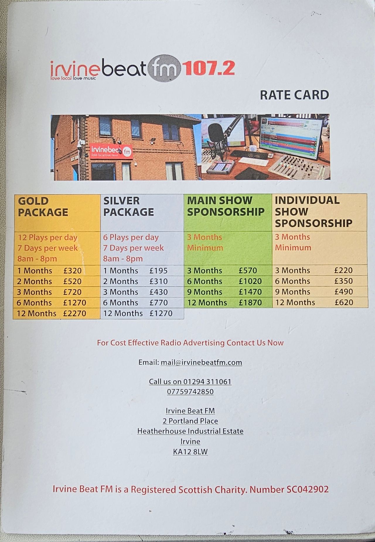 When you Advertise with Irvine Beat FM your Company or Businness is reraching the whole of Ayrshire. You are also supporting us as a local Charity.
